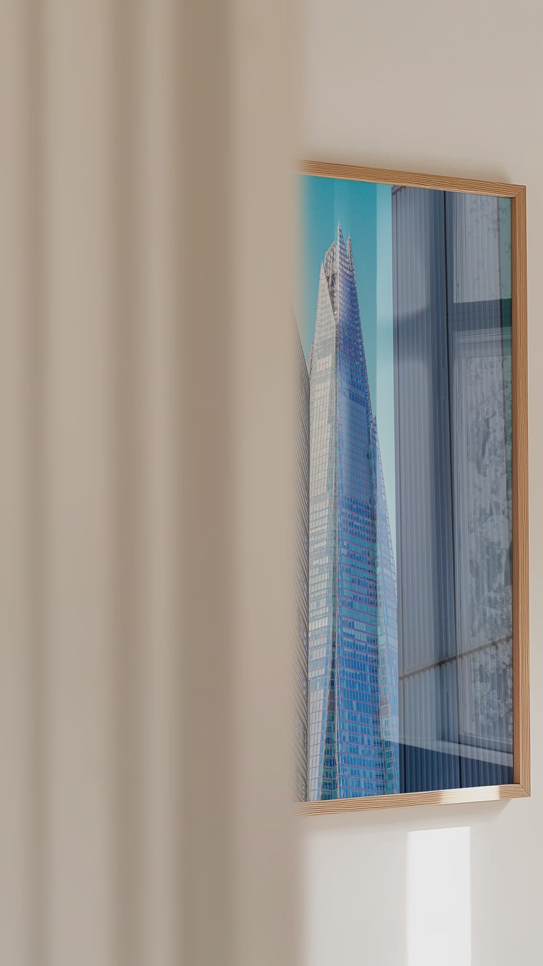 The Shard framed between modern glass and steel buildings, captured on a clear London day. This photograph highlights the rhythm of architecture and reflection, bringing depth and colour to a familiar city scene. A refined piece for anyone who enjoys design, travel, or urban photography. Works well in offices, studios, or contemporary living spaces.