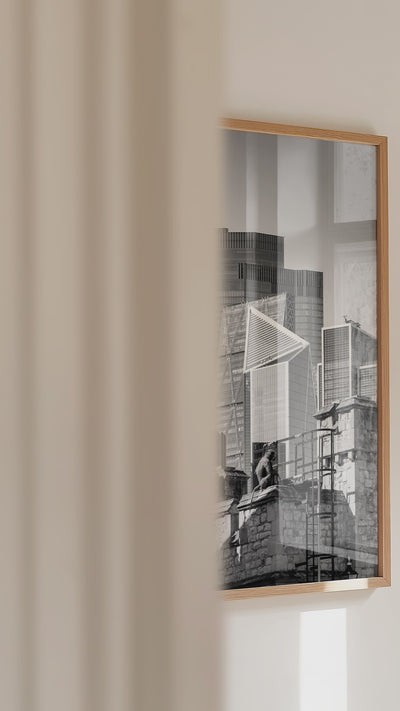 The historic Tower of London meets the modern City skyline in this striking black and white composition. This urban architecture photography captures the stark contrast between London's medieval past and gleaming present. Perfect for spaces that appreciate history, change, and bold visual statements.