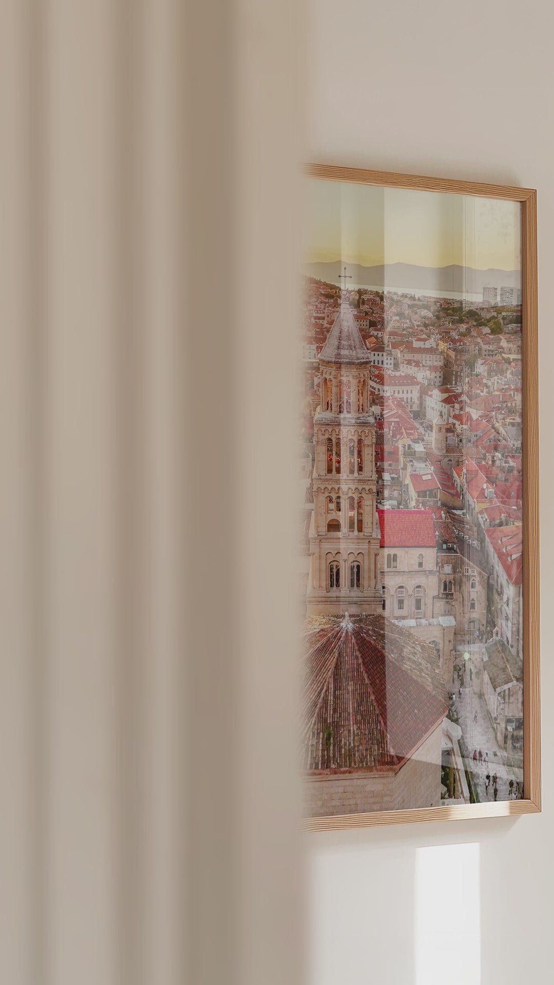 Split's terracotta rooftops bathed in golden hour light, with the bell tower standing tall against distant mountains. This coastal travel photography captures the warmth and character of Croatia's historic Dalmatian coast, perfect for bringing a sense of wanderlust into your home.