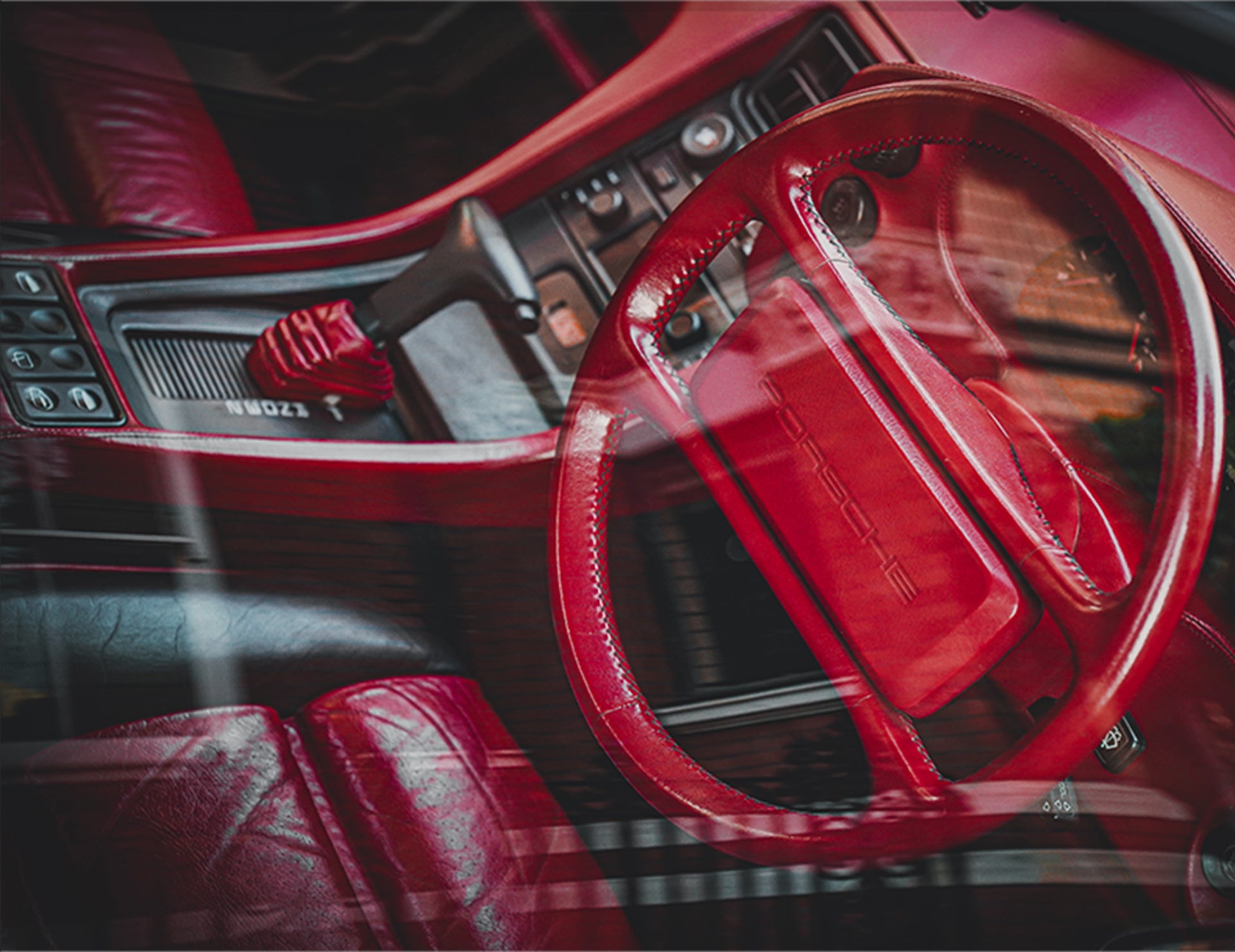 A close view through the window of a classic Porsche, where reflections meet deep red leather and precise design. This photograph captures the beauty of craftsmanship and detail, offering a look at movement and stillness in one frame. Ideal for anyone drawn to cars, design, or striking modern photography. Works well in offices, studios, or contemporary living spaces.