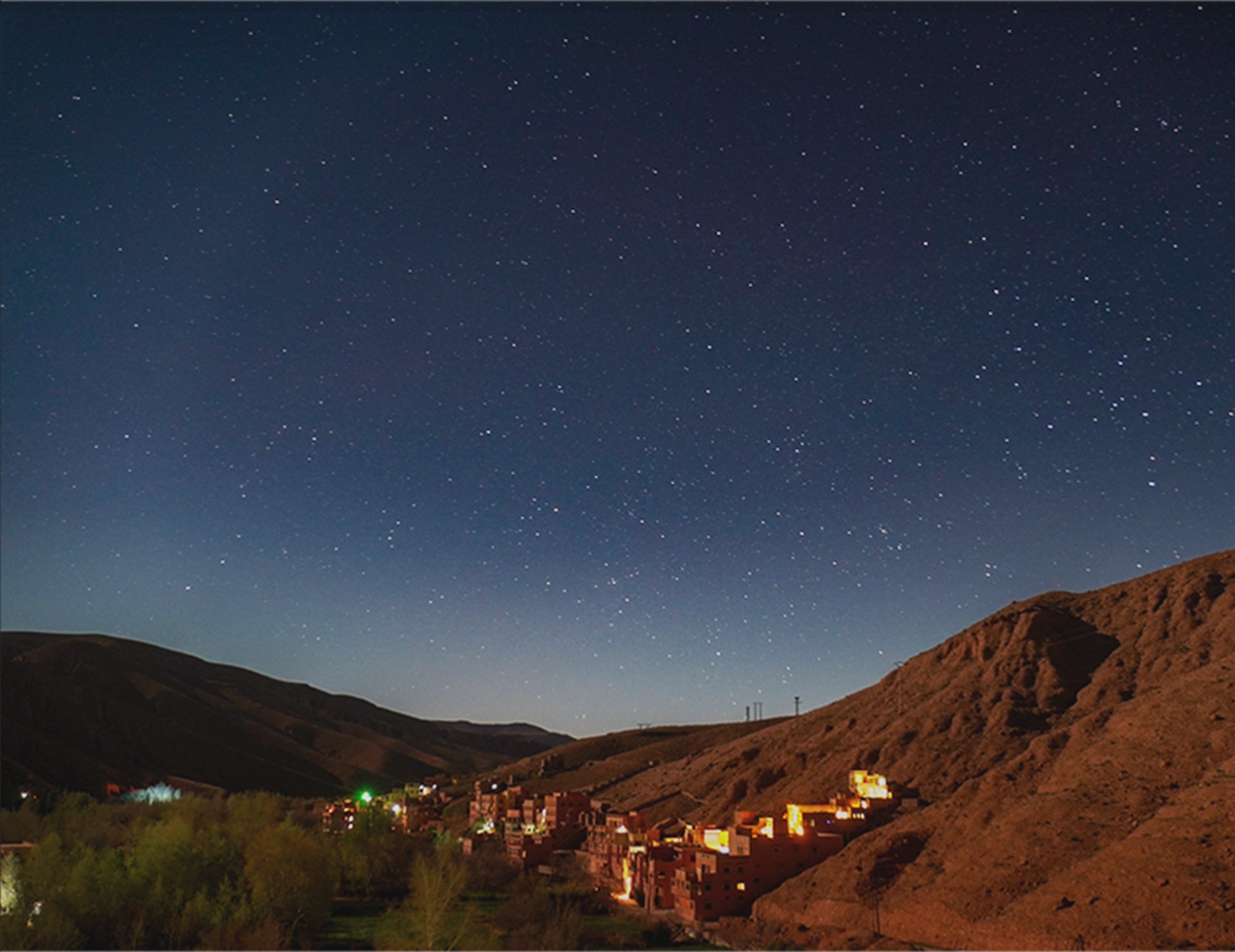 A Moroccan village glows softly beneath an endless starlit sky, nestled between desert hills. This night sky photography captures the quiet magic of desert nights, where warm village lights meet infinite stars. Perfect for bringing a sense of peace and wonder into your space.