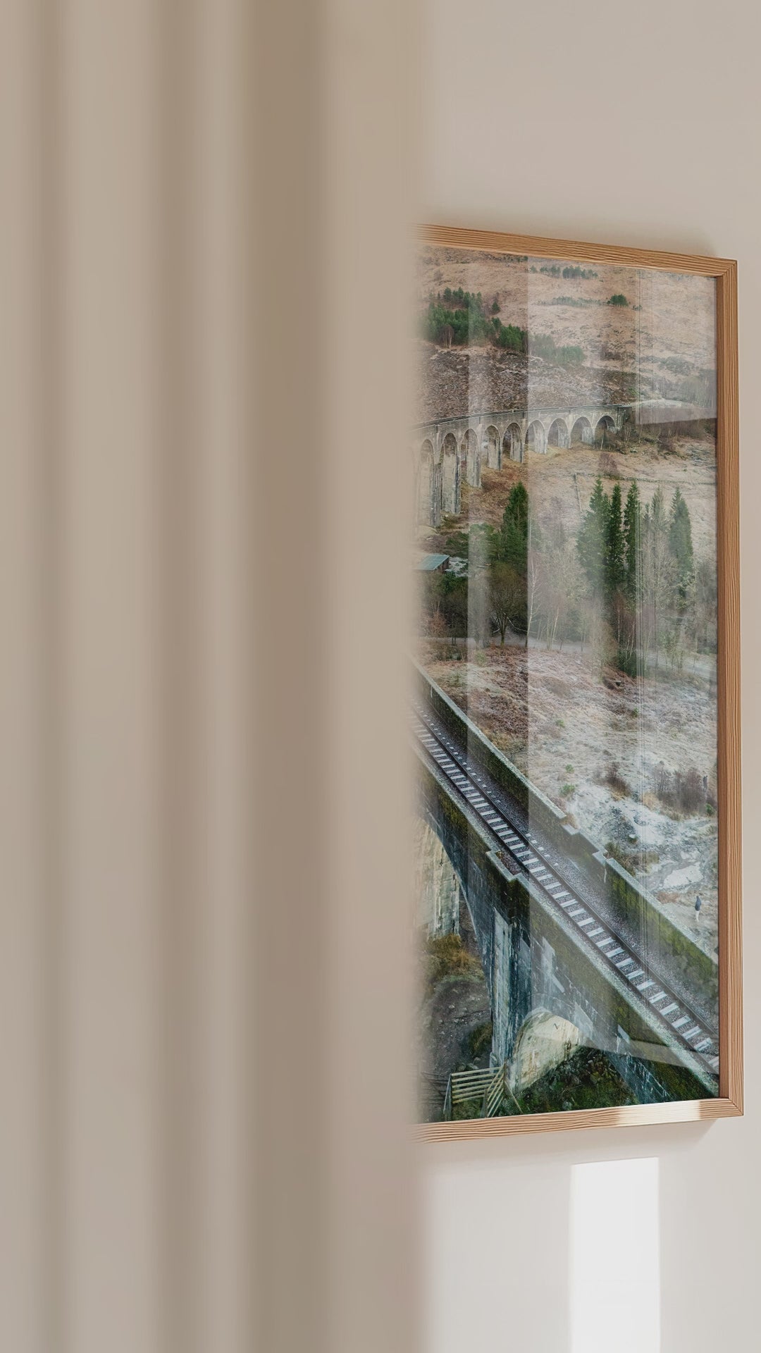 A sweeping curve of stone arches carries the railway across a quiet valley, guiding the eye steadily through the landscape. This architectural photograph balances strength and stillness, where engineered precision meets open, rugged terrain. The repeating arches and gentle bend create a natural rhythm, giving the image a sense of movement without urgency. Ideal for modern interiors, workspaces, or calm living areas where structure and atmosphere can coexist without overpowering the room.