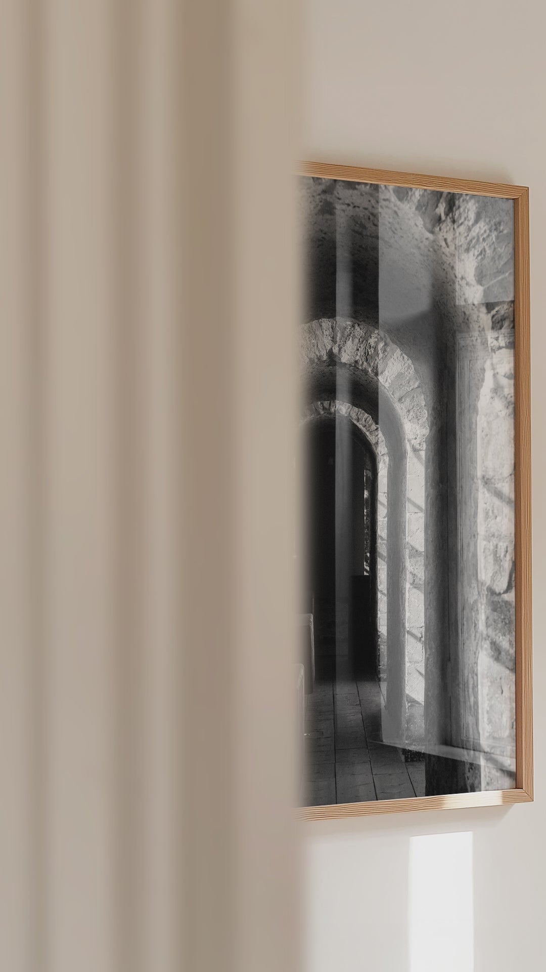 Light and shadow fall across a narrow stone corridor inside the Tower of London, revealing the textures and depth of centuries-old architecture. This black and white photograph captures a quiet moment within historic walls. It is ideal for anyone who loves London’s history, architecture, or simple, character-filled spaces. Looks great in a hallway, study, or living room.